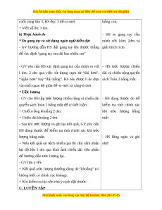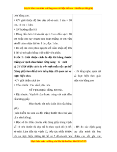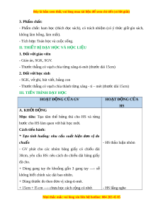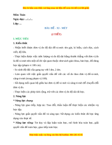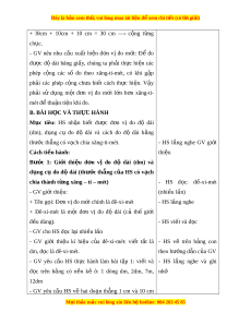 Đây là bản xem th , vu ử i lòng mua tài li u ệ đ xe ể m chi ti t (c ế ó l i ờ gi i ả ) 3. Phẩm ch t ấ : - Ph m ẩ ch t ấ : ham h c ọ (thích đ c ọ sách), có trách nhi m ệ (có ý th c ứ giữ gìn sách, không làm h ng, ỏ làm m t ấ ). - Tích h p: ợ Toán h c và cu ọ c ộ s ng. ố II. THIẾT B D Ị ẠY H C Ọ VÀ H C Ọ LI U Ệ 1. Đ i ố v i ớ giáo viên - Giáo án, SGK, SGV. - Thư c t ớ h ng ẳ có v ch ạ chia t ng xăng- ừ ti-mét (thư c dài ớ 15cm) 2. Đ i ố v i ớ h c s ọ inh - SGK, v ghi ở , bút vi t ế , b ng con ả - Thư c t ớ h ng ẳ có v ch ạ chia thành t ng xăng - ừ ti – mét (thư c ớ dài 15cm) III. TI N Ế TRÌNH D Y Ạ H C Ọ HOẠT Đ N Ộ G C A Ủ GV HOẠT Đ N Ộ G C A Ủ HS A. KH I Ở Đ N Ộ G Mục tiêu: T o ạ tâm thế h ng ứ thú cho HS và t ng ừ bư c ớ cho HS làm quen v i ớ bài h c ọ m i ớ . Cách ti n hà ế nh: * T o ạ tình hu ng: ố nhu c u ầ xu t ấ hi n ệ đ n ơ vị đo chuẩn - HS th o l ả u n ậ nhóm