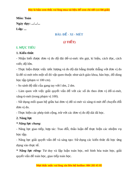 Ngày dạy: .../.../... L p: ớ ... BÀI: ĐỀ - XI - MÉT (2 TIẾT) I. M C Ụ TIÊU 1. Ki n t ế h c ứ - Nh n ậ bi t ế đư c ợ đ n ơ vị đo độ đài đ - ề xi-mét: tên g i ọ , kí hi u, ệ cách đ c, ọ cách vi t ế ; đ l ộ n. ớ - Th c ự hi n ệ đư c ợ vi c ệ ư c ớ lư ng ợ và đo đ ộ dài b ng ằ thư c ớ th ng ẳ v i ớ đ n ơ v ịđo là đ - ề xi-mét trên m t ộ số đó v t ậ quen thu c ộ nh