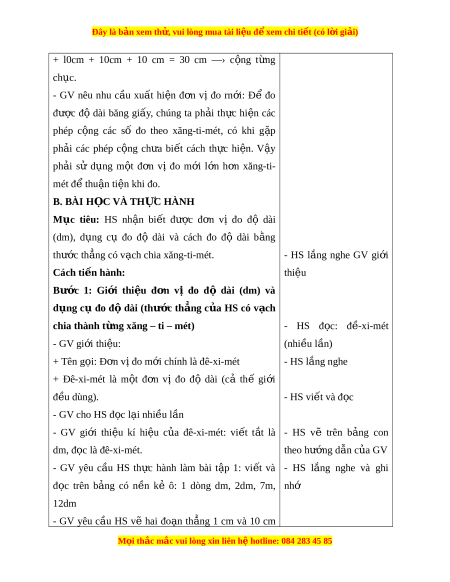 ộ các số đo theo xăng-ti-mét, có khi g p ặ ph i ả các phép c ng ộ ch a ư bi t ế cách th c ự hi n. ệ V y ậ ph i ả sử d ng ụ m t ộ đ n ơ vị đo m i ớ l n ớ h n ơ xăng-ti- mét đ t ể hu n ậ ti n kh ệ i đo. B. BÀI H C Ọ VÀ TH C Ự HÀNH Mục tiêu: HS nh n ậ bi t ế đư c ợ đ n ơ vị đo độ dài (dm), d ng
