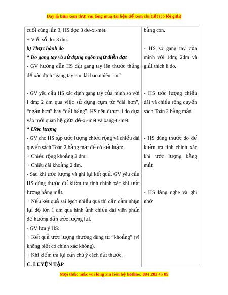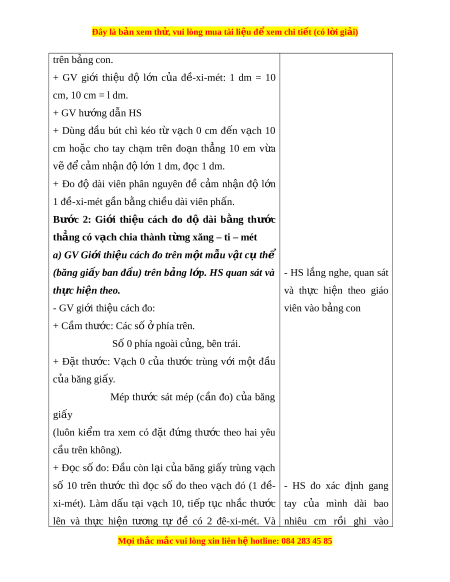 ư sách giáo khoa, bàn h c, ọ đ ồ dùng h c ọ t p ( ậ ph m ạ vi 100 cm). - So sánh độ d i ả c a ủ gang tay v i ớ l dm, 2 dm. - Làm quen v i ớ vi c ệ gi i ả quy t ế v n ấ đề v i ớ các số đo theo đ n ơ vị đ - ề xi-mét, xăng-ti-mét (trong ph m ạ v 100 ị ). - Sử d ng ụ m i ố quan hệ gi a ữ hai đ n ơ v ịđ -