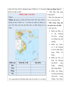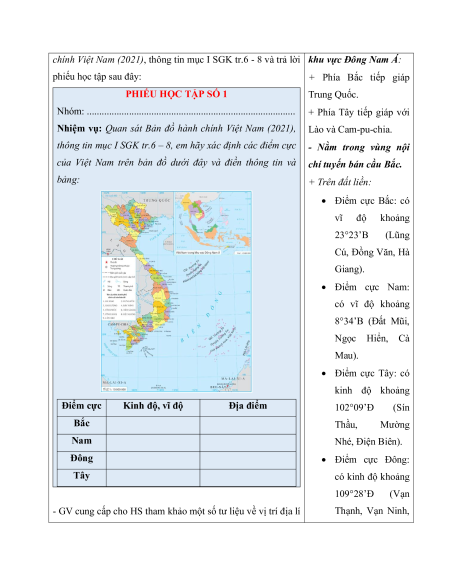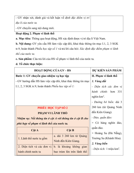 - Hình ảnh, video về vị trí địa lí, phạm vi lãnh thổ Việt Nam. - Phiếu học tập.