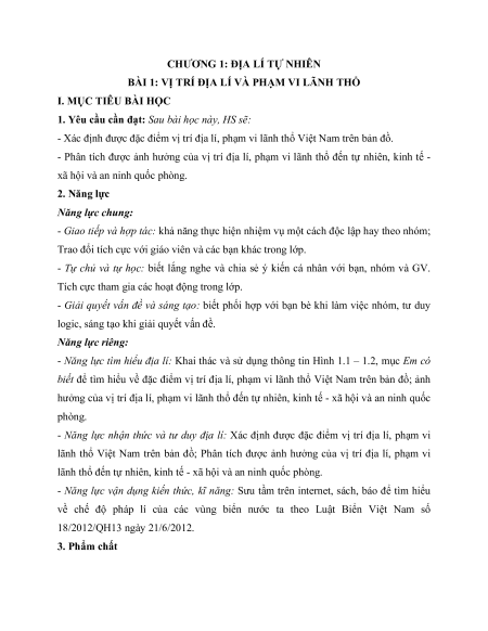 BÀI 1: VỊ TRÍ ĐỊA LÍ VÀ PHẠM VI LÃNH THỔ I. MỤC TIÊU BÀI HỌC
