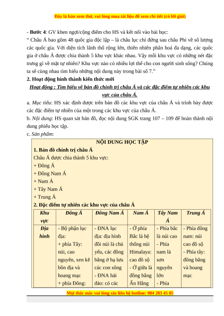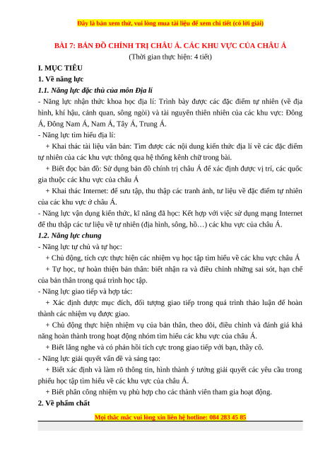 Giáo án Địa lí 7 Bài 7 Cánh diều: Bản đồ chính trị Châu Á. Các khu vực Châu Á
