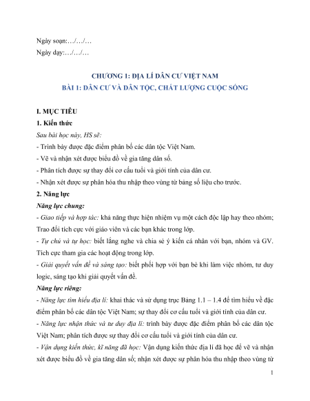 BÀI 1: DÂN CƯ VÀ DÂN TỘC, CHẤT LƯỢNG CUỘC SỐNG I. MỤC TIÊU 1. Kiến thức