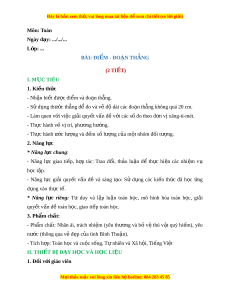 Ngày dạy: .../.../... L p: ớ ... BÀI: ĐI M Ể - ĐO N Ạ TH N Ẳ G (2 TIẾT) I. M C Ụ TIÊU 1. Ki n t ế h c ứ - Nh n bi ậ t ế được đi m ể và đo n ạ th ng. ẳ - S d ử ng t ụ hư c ớ th ng ẳ đ đo và v ể đ ẽ dài ộ các đo n t ạ h ng ẳ không quá 20 cm. - Làm quen v i ớ vi c gi ệ i ả quy t ế v n đ ấ v ề i ớ các s đo t ố heo đ n v ơ xăng- ị ti-mét. - Th c hành v ự ề v t ị rí, phư ng h ơ ư ng. ớ - Th c hành ự ư c ớ lư ng và đ ợ m ế s l ố ư ng c ợ a ủ m t ộ nhóm đ i ố tư ng. ợ 2. Năng l c ự