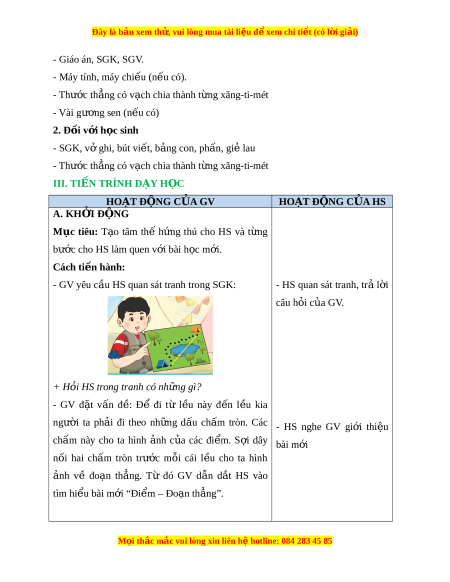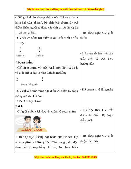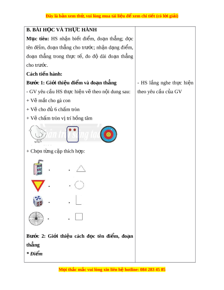 Đây là bản xem th , vu ử i lòng mua tài li u ệ đ xe ể m chi ti t (c ế ó l i ờ gi i ả ) B. BÀI H C Ọ VÀ TH C Ự HÀNH Mục tiêu: HS nh n ậ bi t ế đi m ể , đo n ạ th ng; ẳ đ c ọ tên đê m ỉ , đo n ạ th ng ẳ cho trư c; ớ nh n ậ d ng ạ đi m ể , đo n ạ th ng ẳ trong th c ự t , ế đo độ dài đo n ạ th ng ẳ cho trư c. ớ Cách ti n hà ế nh: Bước 1: Gi i ớ thi u đi ệ m ể và đo n t ạ h ng ẳ - HS l ng ắ nghe th c ự hi n ệ - GV yêu cầu HS th c ự hi n v ệ t ẽ heo n i ộ dung sau: theo yêu c u c ầ a ủ GV + V m ẽ t ắ cho gà con + V cho đ ẽ 6 ch ủ m ấ tròn + V ch ẽ m ấ tròn v t ị rí h ng t ồ âm + Ch n ọ t ng c ừ p ặ thích h p: ợ Bước 2: Gi i ớ thi u ệ cách đ c ọ tên đi m ể , đo n ạ thẳng * Đi m ể M i