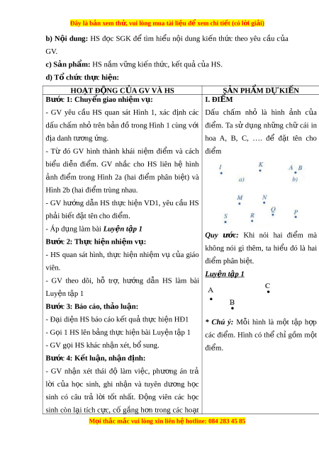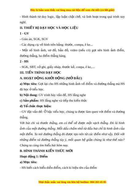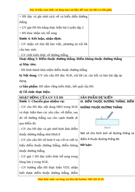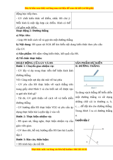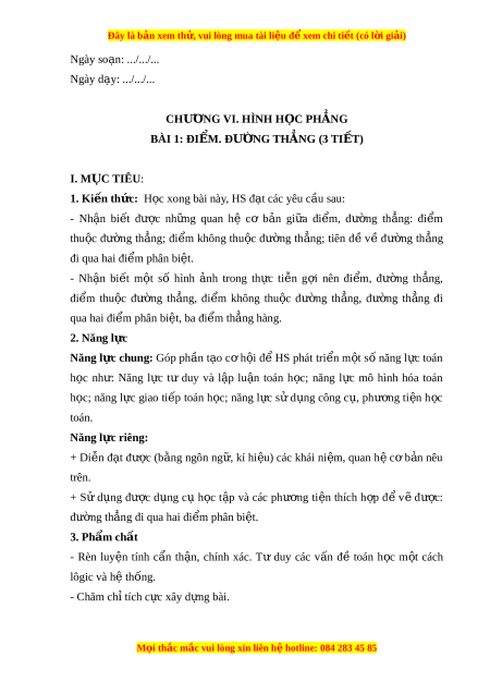 Đây là bản xem th , vu ử i lòng mua tài li u ệ đ xe ể m chi ti t ế (có l i ờ gi i ả ) Ngày so n: ạ .../.../... Ngày d y: ạ .../.../... CHƯ N Ơ G VI. HÌNH H C Ọ PH N Ẳ G BÀI 1: ĐIỂM. ĐƯ N Ờ G TH N Ẳ G (3 TI T Ế ) I. M C Ụ TIÊU: 1. Ki n t ế h c ứ : H c ọ xong bài này, HS đ t ạ các yêu c u s ầ au: - Nh n ậ bi t ế đư c ợ nh ng ữ quan hệ cơ b n ả gi a ữ đi m ể , đư ng ờ th ng: ẳ đi m ể thu c ộ đư ng ờ th ng; ẳ đi m ể không thu c ộ đư ng ờ th ng; ẳ tiên đ ề v ề đư ng ờ th ng ẳ đi qua hai đi m ể phân bi t ệ . - Nh n ậ bi t ế m t ộ số hình nh ả trong th c ự ti n ễ g i ợ nên đi m ể , đư ng ờ th ng, ẳ đi m ể thu c ộ đư ng ờ th ng, ẳ đi m ể không thu c ộ đư ng ờ th ng, ẳ đư ng ờ th ng ẳ đi qua hai đi m ể phân biệt, ba đi m ể th ng hàng. ẳ 2. Năng l c ự Năng l c ự chung: Góp ph n ầ t o ạ c ơ h i ộ đ ể HS phát tri n ể m t ộ s ố năng l c ự toán h c ọ nh : ư Năng l c ự tư duy và l p ậ lu n ậ toán h c; ọ năng l c ự mô hình hóa toán h c; ọ năng l c ự giao ti p ế toán h c; ọ năng l c ự s ử d ng ụ công c , ụ phư ng ơ ti n ệ h c ọ toán. Năng l c ự riêng: + Di n ễ đ t ạ đư c ợ (b ng ằ ngôn ng , ữ kí hi u ệ ) các khái ni m ệ , quan h ệ c ơ b n ả nêu trên. + Sử d ng ụ đư c ợ d ng ụ cụ h c ọ t p ậ và các phư ng ơ ti n ệ thích h p ợ đ ể v ẽ đư c: ợ đư ng t ờ h ng ẳ đi qua hai đi m ể phân bi t ệ . 3. Ph m ẩ chất - Rèn luy n ệ tính c n ẩ th n,