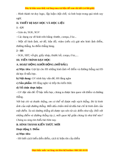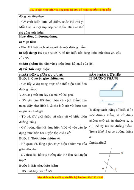 Đây là bản xem th , vu ử i lòng mua tài li u ệ đ xe ể m chi ti t ế (có l i ờ gi i ả ) đ ng h ộ c t ọ i p t ế heo. - GV ch t ố ki n ế th c ứ về đi m ể , nh c ắ HS chú ý: Mỗi hình là m t ộ t p ậ h p ợ các đi m ể . Hình có thể chỉ gồm m t ộ đi m ể . Hoạt đ ng 2: ộ Đư ng t ờ hẳng a) M c t ụ iêu: - Giúp HS bi t ế cách v và g ẽ i ọ tên m t ộ đư ng t ờ h ng ẳ b) N i
