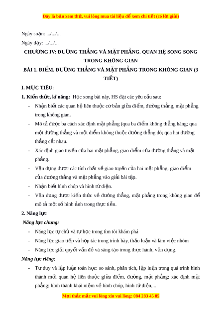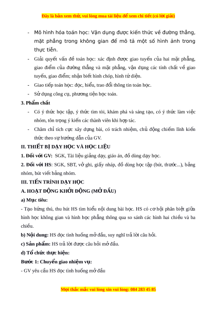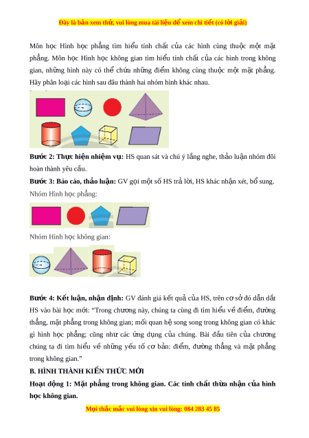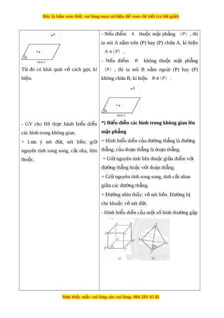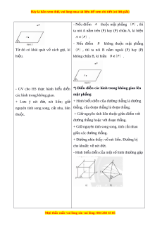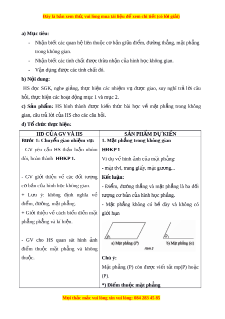 Đây là bản xem th , vu ử i lòng mua tài li u ệ đ xe ể m chi ti t ế (có l i ờ gi i ả ) a) M c ụ tiêu: - Nh n ậ bi t ế các quan h ệ liên thu c ộ c ơ b n ả gi a ữ đi m ể , đ n ườ g th n ẳ g, m t ặ ph n ẳ g trong không gian. - Nh n ậ bi t ế các tính ch t ấ đ c ượ th a ừ nh n ậ c a ủ hình h c ọ không gian. - V n ậ d n ụ g đ c ượ các tính ch t ấ đó. b) N i ộ dung: HS đ c ọ SGK, nghe gi n ả g, th c ự hi n ệ các nhi m ệ vụ đ c ượ giao, suy nghĩ tr ả l i ờ câu h i ỏ , th c ự hi n ệ các ho t ạ đ n ộ g m c ụ 1 và m c ụ 2. c) S n ả ph m