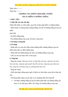 BÀI 32: ĐIỂM VÀ ĐƯ N Ờ G THẲNG I. M C Ụ TIÊU 1. Mức đ / ộ yêu c u c ầ n đ ầ t ạ Nh n bi ậ t ế đư c ợ các khái ni m ệ , quan h c ệ ơ b n gi ả a đi ữ m ể và đư ng t ờ h ng: ẳ - Đi m ể thu c ộ và không thu c đ ộ ư ng ờ th ng; ẳ tiên đ v ể đ ề ư ng ờ th ng đi ẳ qua hai đi m ể phân biệt. - Ba đi m ể th ng hàng. ẳ - Hai đư ng t ờ h ng s ẳ ong song, c t ắ nhau, trùng nhau.