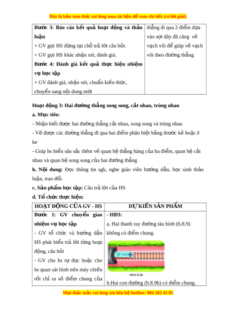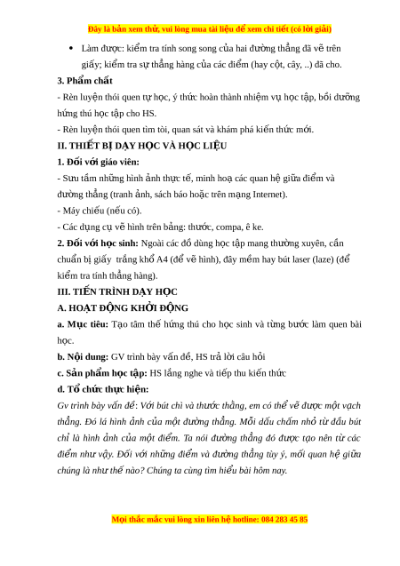 Đây là bản xem th , vu ử i lòng mua tài li u ệ đ xe ể m chi ti t ế (có l i ờ gi i ả ) Làm đư c: ợ ki m ể tra tính song song c a ủ hai đư ng t ờ h ng ẳ đã v t ẽ rên giấy; ki m ể tra sự th ng hàng c ẳ a ủ các đi m ể (hay c t ộ , cây, ..) đã cho. 3. Ph m ẩ chất - Rèn luy n t ệ hói quen t h ự c, ý t ọ h c hoàn ứ thành nhi m ệ vụ h c t ọ p, b ậ i ồ dư ng ỡ h ng t ứ hú h c t ọ p ậ cho HS. - Rèn luy n t