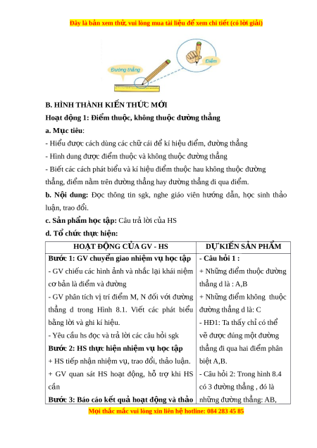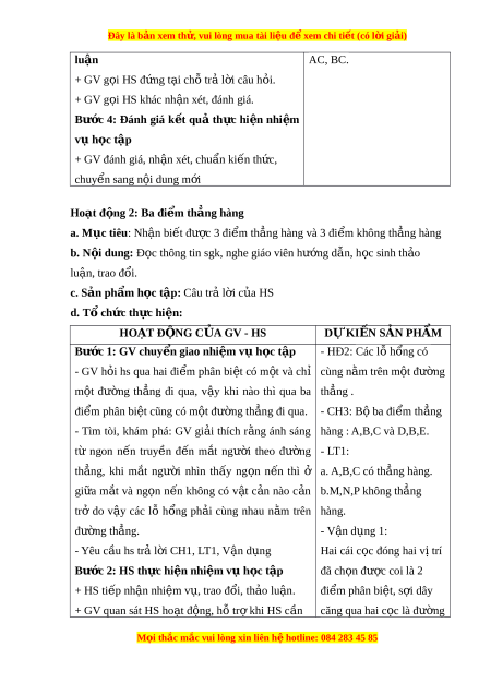 Đây là bản xem th , vu ử i lòng mua tài li u ệ đ xe ể m chi ti t ế (có l i ờ gi i ả ) luận AC, BC. + GV g i ọ HS đ ng ứ t i ạ ch t ỗ r l ả i ờ câu h i ỏ . + GV g i ọ HS khác nh n xét ậ , đánh giá. Bư c ớ 4: Đánh giá k t ế quả th c ự hi n ệ nhi m ệ vụ h c t ọ ập + GV đánh giá, nh n xét ậ , chu n ki ẩ n t ế h c, ứ chuy n s ể ang n i ộ dung m i ớ Hoạt đ ng ộ 2: Ba đi m ể th ng h ẳ àng a. Mục tiêu: Nh n ậ bi t ế đư c 3 đi ợ m ể th ng ẳ hàng và 3 đi m ể không th ng ẳ hàng b. N i ộ dung: Đ c