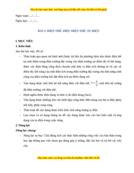 BÀI 3: ĐIỆN THẾ, HIỆU ĐIỆN THẾ, TỤ ĐIỆN I. MỤC TIÊU 1. Kiến thức