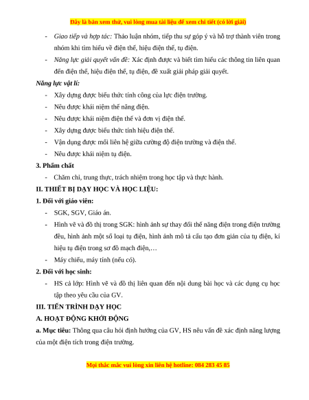 Hoạt động 1. Hình thành khái niệm thế năng điện a. Mục tiêu: