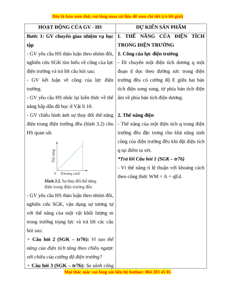điện trong điện trường đều (hình 3.2) cho - Thế năng của một điện tích q trong điện HS quan sát.