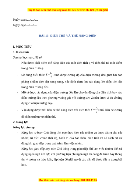 BÀI 13: ĐIỆN THẾ VÀ THẾ NĂNG ĐIỆN I. MỤC TIÊU 1. Kiến thức