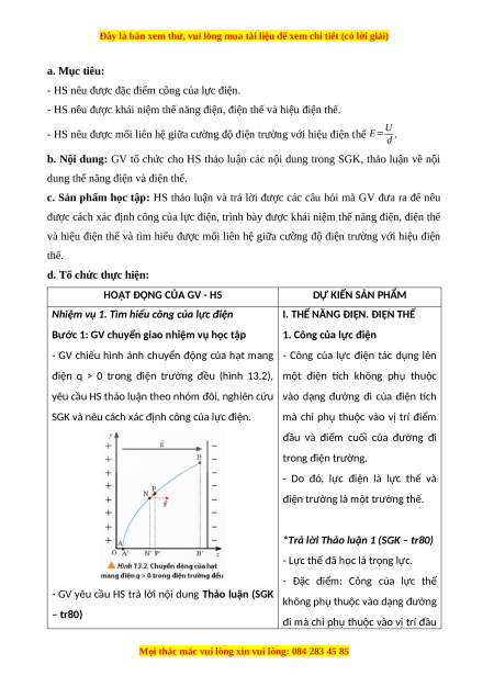 - HS nêu được khái niệm thế năng điện, điện thế và hiệu điện thế.