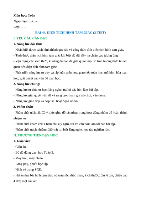 Giáo án Diện tích hình tam giác Toán lớp 5 Chân trời sáng tạo