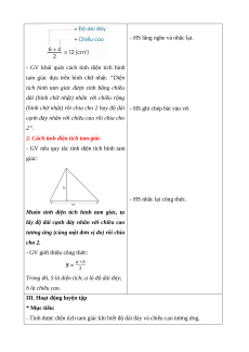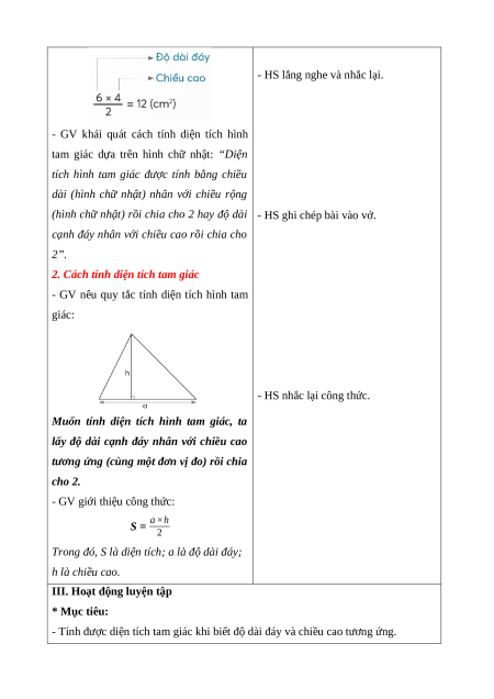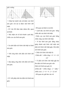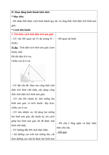 - HS nhận biết được cách hình thành quy tắc và công thức tính diện tích hình tam giác. * Cách tiến hành: