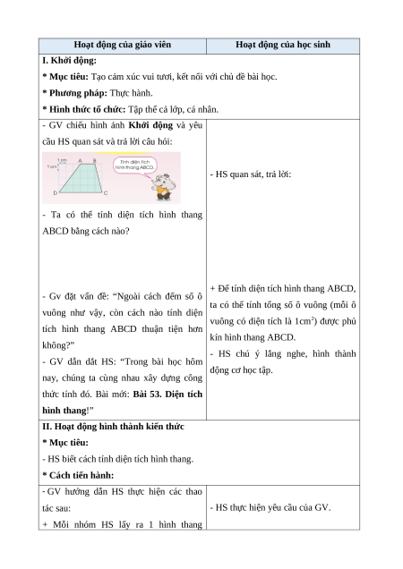 thức tính đó. Bài mới: Bài 53. Diện tích hình thang!”