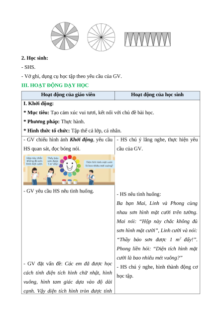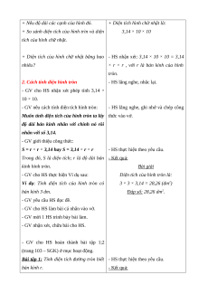 - HS nhận biết được cách hình thành quy tắc và công thức tính diện tích hình tròn. * Cách tiến hành: