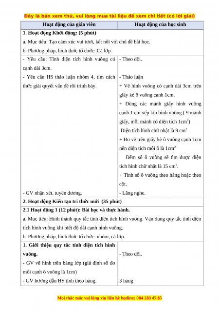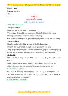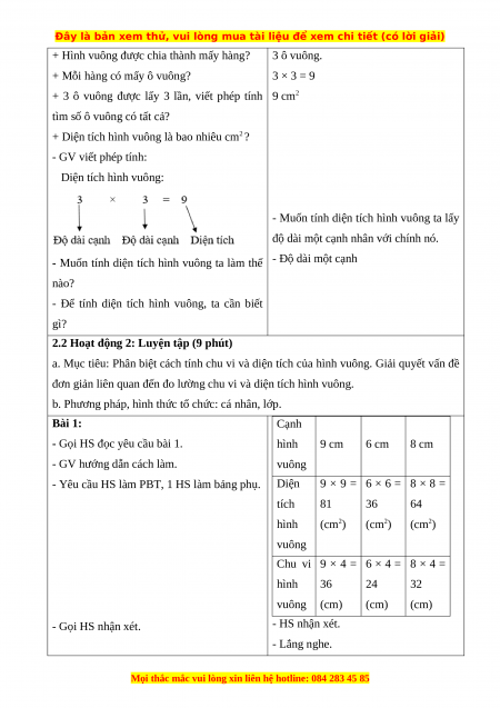 Giáo án Diện tích hình vuông Toán 3 Chân trời sáng tạo
