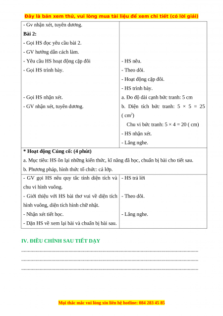 - Giải quyết vấn đề đơn giản liên quan đến đo lường chu vi và diện tích hình vuông. 2. Năng lực chung:
