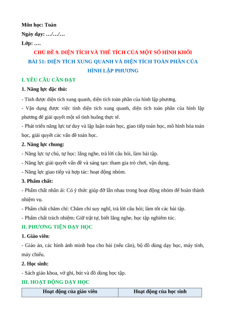 BÀI 51: DIỆN TÍCH XUNG QUANH VÀ DIỆN TÍCH TOÀN PHẦN CỦA HÌNH LẬP PHƯƠNG