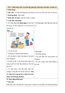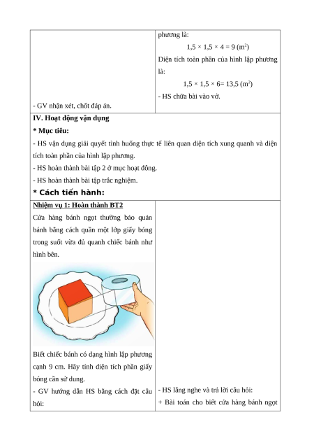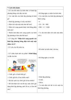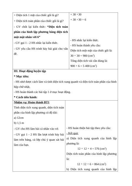 Nhớ được cách tính diện tích xung quanh và diện tích toàn phần của hình lập phương. * Cách tiến hành: