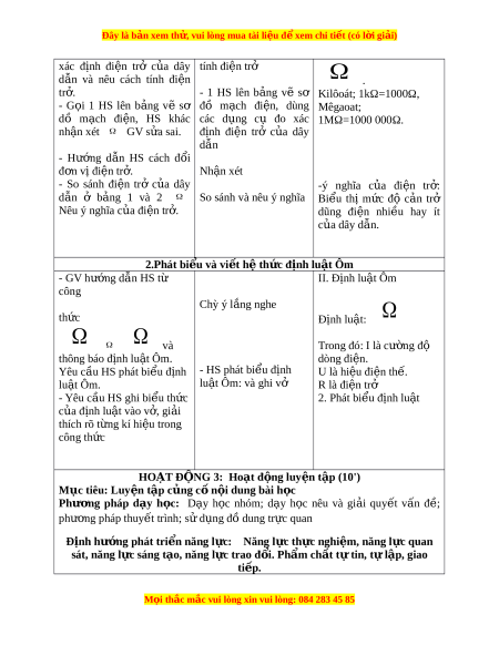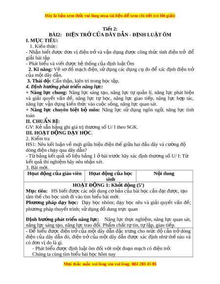 Đây là bản xem th , vu ử i lòng mua tài li u ệ đ xe ể m chi ti t (c ế ó l i ờ gi i ả ) Ti t ế 2: BÀI2: ĐI N Ệ TRỞ C A Ủ DÂY D N Ẫ - Đ N Ị H LU T Ậ ÔM I. M C Ụ TIÊU: 1. Ki n t ế h c ứ : - Nh n ậ bi t ế đư c ợ đ n ơ v ịđi n ệ tr ở và v n ậ d ng ụ đư c ợ công th c ứ tính đi n ệ tr ở để gi i ả bài t p ậ - Phát bi u và vi ể t ế đư c ợ h t ệ h ng c ố a ủ đ nh l ị u t ậ Ôm