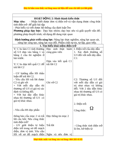 Ộ G 2: Hình thành ki n t ế h c ứ Mục tiêu: - Nh n ậ bi t ế đư c ợ đ n ơ vị đi n ệ trở và v n ậ d ng ụ đư c ợ công th c ứ tính đi n t ệ rở đ gi ể i ả bài t p ậ - Phát bi u và vi ể t ế đư c ợ h t ệ h ng c ố a ủ đ nh l ị u t ậ Ôm Phư ng ơ pháp d y ạ h c: ọ D y ạ h c ọ nhóm; d y ạ h c ọ nêu và gi i ả quy t ế v n ấ đề; phư ng ơ pháp thuy t ế trình; s d ử ng đ ụ ồ dung tr c ự quan Đ nh h ị ư ng ớ phát tri n năng l ể c ự : Năng l c t ự h c nghi ự m ệ , năng l c quan s ự át, năng l c s ự áng t o, năng l ạ c ự trao đ i ổ . Ph m ẩ ch t ấ t t ự in, t l ự p, ậ giao ti p. ế 1. Tìm hi u khái ể ni m ệ đi n t ệ rở Y/ C hs làm C1 tính thư ng ơ H c ọ sinh th c ự hành I. Đi n t ệ r c ở a ủ dây d n ẫ số U/I d a ự vào b ng ả 1 và cùng giáo viên 1. Xác đ nh ị thư ng ơ số b ng ả 2 c a ủ thí nghi m ệ ở U/I đ i ố v i ớ m i ỗ dây d n. ẫ bài trư c. ớ C1: D a ự vào k t ế quả C1 Y/ C hs d a ự k t ế quả C1 để tr l ả i ờ C2 tr l ả i ờ C2 - GV hư ng ớ d n ẫ HS th o ả lu n ậ đ t ể rả l i ờ C2. - Yêu c u ầ HS trả l i ờ đư c ợ C2: Thư ng ơ số U/I đ i ố C2 và ghi v : ở Ghi vở C2 v i ớ m i ỗ dây d n ẫ có giá + V i ớ m i ỗ dây d n ẫ thì trị như nhau và không thư ng