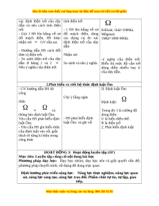 So sánh và nêu ý nghĩa Bi u ể thị m c ứ độ c n ả trở Nêu ý nghĩa c a đi ủ n t ệ r . ở dũng đi n ệ nhi u ề hay ít c a ủ dây dẫn. 2.Phát bi u và vi ể t ế h t ệ h c đ ứ nh l ị u t ậ Ôm - GV hư ng d ớ n H ẫ S t ừ II. Định lu t ậ Ôm công Chỳ ý l ng nghe ắ th c ứ Ω Định lu t ậ : Ω Ω Ω và Trong đó: I là cư ng ờ đ ộ thông báo định lu t ậ Ôm. dòng điện. Yêu c u H ầ S phát bi u ể đ nh ị - HS phát bi u đ ể nh ị U là hi u đi ệ n t ệ h . ế lu t ậ Ôm. lu t ậ Ôm: và ghi vở R là đi n t ệ r ở - Yêu c u H ầ S ghi bi u t ể h c ứ 2. Phát bi u đ ể nh l ị u t ậ c a ủ định lu t ậ vào v , gi ở i ả thích rõ t ng kí ừ hi u t ệ rong công th c ứ HOẠT Đ N Ộ G 3: Ho t ạ đ ng l ộ uy n t ệ p ( ậ 10') Mục tiêu: Luy n ệ t p c ậ ng c ủ n ố i ộ dung bài h c ọ Phư ng ơ pháp d y ạ h c: ọ D y ạ h c ọ nhóm; d y ạ h c ọ nêu và gi i ả quy t ế v n ấ đề; phư ng ơ pháp thuy t ế trình; s d ử ng đ ụ ồ dung tr c ự quan Đ nh h ị ư ng ớ phát tri n năng l ể c
