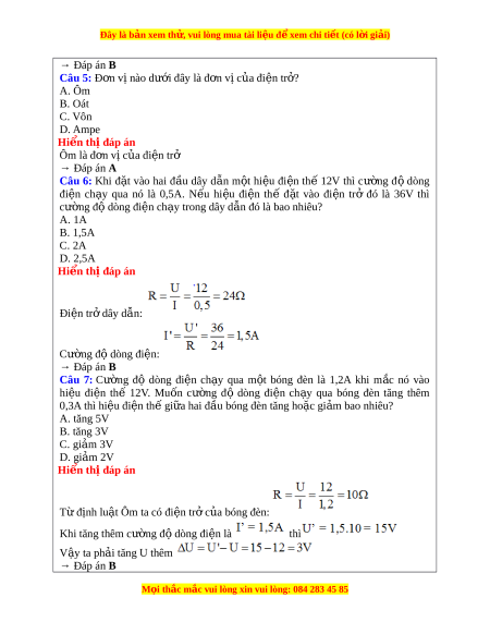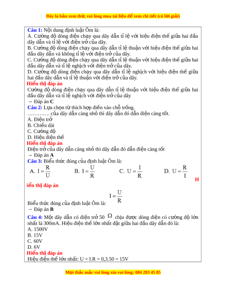 Đây là bản xem th , vu ử i lòng mua tài li u ệ đ xe ể m chi ti t (c ế ó l i ờ gi i ả ) Câu 1: N i ộ dung đ nh l ị u t ậ Ôm là: A. Cư ng ờ độ dòng đi n ệ ch y ạ qua dây d n ẫ t ỉl ệ v i ớ hi u ệ đi n ệ th ế gi a ữ hai đ u ầ dây dẫn và tỉ lệ v i ớ đi n t ệ r c ở a ủ dây. B. Cư ng ờ đ dòng đi ộ n ch ệ y qua dây ạ d n t ẫ l ỉ t ệ hu n v ậ i ớ hi u đi ệ n t ệ h gi ế a hai ữ