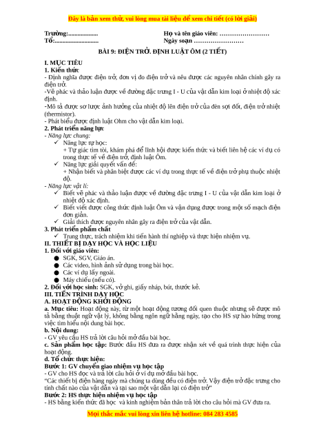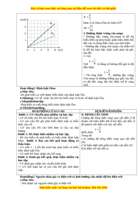 Đây là bản xem th , vu ử i lòng mua tài li u ệ đ xe ể m chi ti t ế (có l i ờ gi i ả ) U R I Đ n v ơ ị là Ohm (Ôm) kí hi u l ệ à 1V 1 1A 3. Đư n ờ g đư c ợ tr n ư g vôn-ampe + Đư ng ờ đ c ặ tr ng ư vôn-ampe là đồ thị biểu di n ễ s ự ph ụ thu c ộ gi a ữ hi u ệ đi n ệ thế đặt vào và dòng đi n c ệ hạy qua linh ki n. ệ + Đư ng ờ đ c ặ tr ng ư vôn-ampe c a ủ đi n ệ trở là đồ thị hàm b c ậ nh t ấ xu t ấ phát từ g c ố tọa đ : ộ I kU 1 k V i ớ R là hằng số không đ i ổ g i ọ là độ dẫn đi n. ệ U I + Từ công th c ứ R , đư ng ờ đ c ặ tr ng ư Vôn-ampe là đư ng ờ th ng ẳ qua g c ố t a ọ đ , ộ có độ d c ố càng l n ớ khi đi n ệ trở R càng nh . ỏ Hoạt đ n ộ g2. Đ n ị h lu t O ậ hm. a.M c ụ tiêu: -Hs phát bi u và ể viết đư c ợ bi u ể th c ứ của đ nh ị luật Ôm. b.N i ộ dung: GV tổ ch c ứ cho HS tìm hi u m ể ục II SGK v đ ề nh l ị u t ậ Ôm. c.S n ả ph m ẩ h c ọ t p ậ : -Phát biểu và vi t ế đúng bi u t ể hức đ nh l ị uật Ôm. d.T c ổ h c ứ ho t ạ đ n ộ g: HO TĐ Ạ ỘNGC A Ủ GV-HS DỰKI N Ế S N Ả PH M Ẩ .Bư c ớ 1: GV chuy n ể giao nhi m v ệ h ụ c ọ t p ậ II. Đ N Ị HLU T Ậ OHM - GV tổ ch c ứ cho HS tìm hi u m ể ục II SGK. Cư ng ờ độ dòng đi n ệ ch y ạ qua v t ậ d n ẫ tỉ lệ - GV yêu c u ầ HS ghi phát bi u ể đ nh ị lu t ậ và bi u ể thuận với hi u ệ đi n ệ thế ở hai đ u ầ v t ậ d n, ẫ tỉ th c ứ vào v . ở l ngh ệ c ị h v i ớ đi n t ệ r c ở a ủ vật dẫn. - GV yêu c u ầ HS cho bi t ế đ n ơ vị c a ủ các đ i ạ U lư ng. ợ I Biểu thức: R Bư c ớ 2: HS th c ự hi n ệ nhi m ệ v h ụ c ọ t p ậ Trong đó: - HS tìm hi u ể về phát bi u ể và bi u ể th c ứ đ nh ị lu t ậ I là cư ng ờ độ dòng đi n ệ ch y ạ qua v t ậ d n ẫ Ohm. Bư c ớ 3: Báo cáo k t ế quả ho t ạ đ n ộ g và (A). thảo luận U là hi u đi ệ n t ệ hế gi a hai ữ đầu vật dẫn (V) - GV m i
