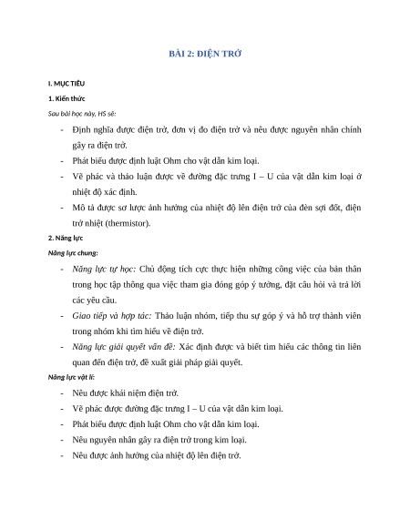 BÀI 2: ĐIỆN TRỞ I. MỤC TIÊU 1. Kiến thức