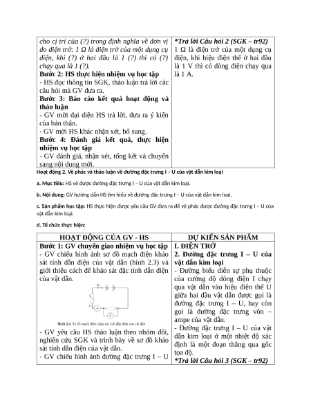 Hoạt động 2. Vẽ phác và thảo luận về đường đặc trưng I – U của vật dẫn kim loại