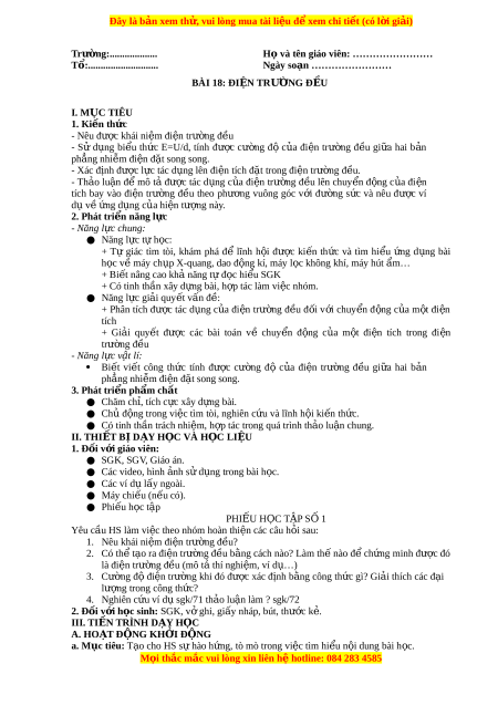 ợ các bài toán về chuy n ể đ ng ộ c a ủ m t ộ đi n ệ tích trong đi n ệ trư ng ờ đ u ề - Năng l c ự vật lí: Biết vi t ế công th c ứ tính được cư ng ờ độ c a ủ đi n ệ trư ng ờ đ u ề gi a ữ hai b n ả phẳng nhiễm đi n đ ệ ặt song song. 3. Phát tri n ể ph m c ẩ h t ấ ● Chăm ch , t ỉ ích c c ự xây d ng bà ự i. ● Ch đ ủ ng t ộ rong vi c ệ tìm tòi, nghiên c u ứ và lĩnh h i ộ ki n ế th c ứ .