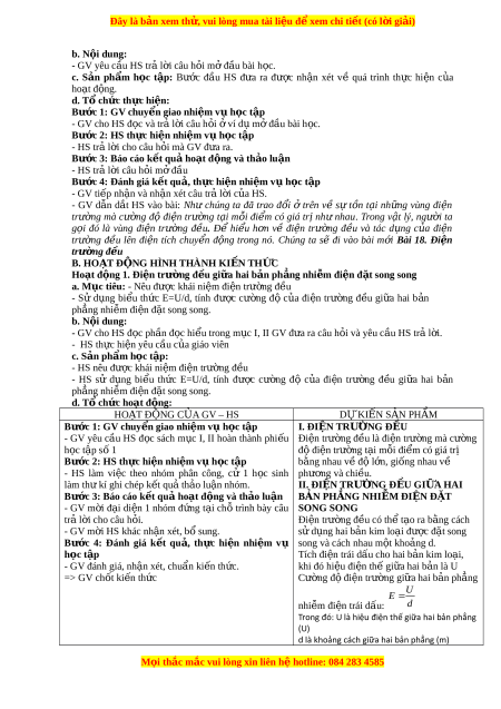 ụ tiêu: - Nêu đư c ợ khái ni m ệ đi n t ệ rư ng ờ đ u ề - Sử d ng ụ bi u ể th c ứ E=U/d, tính đư c ợ cư ng ờ độ c a ủ đi n ệ trư ng ờ đ u ề gi a ữ hai b n ả phẳng nhiễm đi n đ ệ ặt song song. b. N i ộ dung: - GV cho HS đ c ọ phần đ c ọ hi u t ể rong m c ụ I, II GV đ a ư ra câu h i ỏ và yêu c u H ầ S tr l ả i ờ . - HS thực hi n yê ệ u cầu của giáo viên c. S n ả ph m h ẩ c ọ t p ậ : - HS nêu được khái ni m ệ đi n ệ trư ng đ ờ u ề - HS sử d ng ụ bi u ể th c ứ E=U/d, tính đư c ợ cư ng ờ độ c a ủ đi n ệ trư ng ờ đ u ề gi a ữ hai b n ả phẳng nhiễm đi n đ ệ ặt song song. d. T c ổ h c ứ ho t đ ạ n ộ g: HOẠT Đ N Ộ G C A Ủ GV – HS D K Ự IẾN S N Ả PH M Ẩ Bư c ớ 1: GV chuy n ể giao nhi m v ệ h ụ c ọ t p ậ I. ĐI N Ệ TRƯỜNG Đ U Ề - GV yêu c u ầ HS đ c ọ sách m c ụ I, II hoàn thành phi u ế Đi n t ệ rư ng đ ờ ều là đi n t ệ rư ng ờ mà cư ng ờ h c ọ tập s 1 ố độ đi n t ệ rư ng ờ tại mỗi đi m ể có giá tr ị Bư c ớ 2: HS th c ự hi n ệ nhi m ệ v h ụ c ọ t p ậ bằng nhau về đ l ộ n, ớ gi ng ố nhau v ề - HS làm vi c