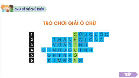 TRÒ CHƠI GIẢI Ô CHỮ 1 C Ứ U Q U Ố C 2 T H Á N H G I Ó N G 3 V Ừ A D Í N H 4 Đ I N H B Ộ L Ĩ N H 5 G H I N H Ớ 6 K I M Đ Ồ N G TIẾP