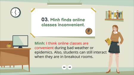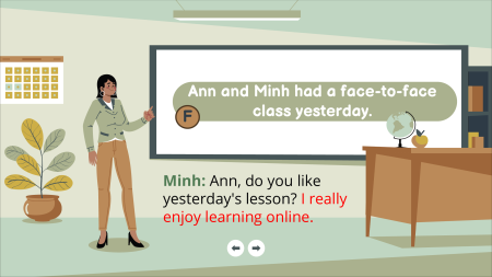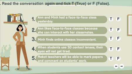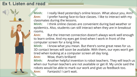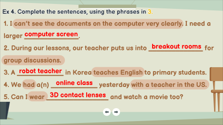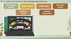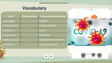 trực tiếp, mặt đối mặt 3. epidemic (n) /ˌepɪˈdemɪk/ đại dịch 4. contact lens (n) /ˈkɒntækt lenz/ kính áp tròng 5. breakout room (n) /ˈbreɪkaʊt ruːm /