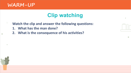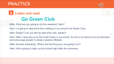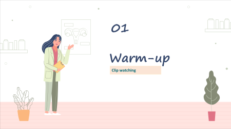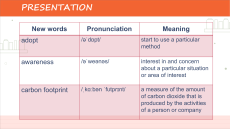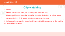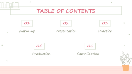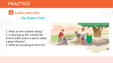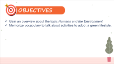 ü Memorize vocabulary to talk about activities to adopt a green lifestyle. TABLE OF CONTENTS 01 02 03 Warm-up Presentation Practice 04 05 Production Consolidation 01 Warm-up Clip watching