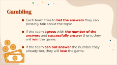 ● Each team tries to bet the answers they can possibly talk about the topic.