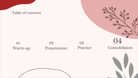 ü Familiarize with new learning activities ü Develop self-study skil s Table of contents 04 01 02 03 Warm-up Presentation Practice Consolidation 01 Warm-up