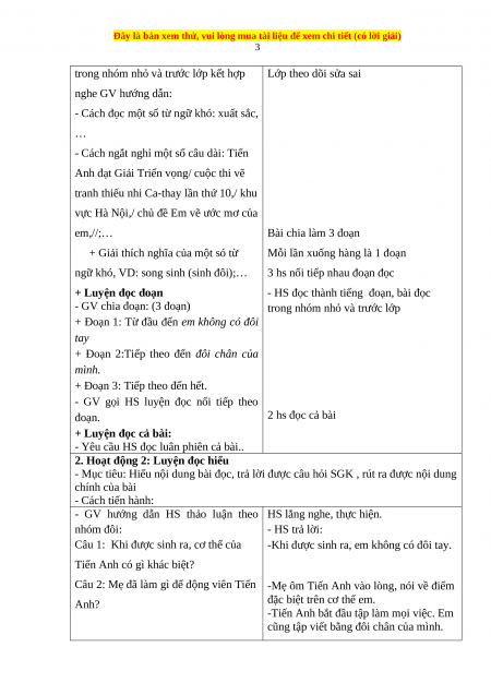 3. Phẩm chất: Có ý thức chăm đọc sách; Biết hợp tác cùng bạn.