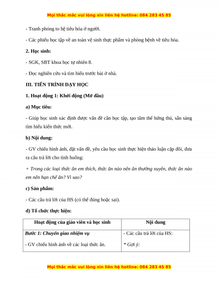 - Các phiếu học tập về an toàn vệ sinh thực phẩm và phòng bệnh về tiêu hóa. 2. Học sinh: