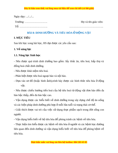 ……………………………….. BÀI 8: DINH DƯ N Ỡ G VÀ TIÊU HÓA Đ Ở N Ộ G V T Ậ I. M C Ụ TIÊU Sau khi h c ọ xong bài h c, H ọ S đ t ạ được các yêu c u s ầ au: 1. V năng l ề c ự 1.1. Năng l c Si ự nh h c ọ - Nêu đư c ợ quá trinh dinh dư ng ơ bao g m ô : l y â th c ư ăn, tiêu hoá, h p â th u và đông hoá chât dinh dư ng. ơ - Nêu đư c ợ khái ni m ê tiêu hoá. - Phân bi t ê đư c t ợ iêu hoá ngo i ạ bào và n i ô bào. - D a ự vào sơ đô (ho c ặ hinh nh) ả ,trinh bày đư c ợ các hinh th c ư tiêu hóa ở đ ng ô v t ậ . - Nêu đư c ợ chi u ê hư ng ơ ti n ê hoá c a u h ê tiêu hoá t ư đ ng ô v t ậ đ n ơ bào đ n ê đa bào b c t ậ hâp, đ n đa bào b ê c ậ cao. - V n ậ d ng u đư c ợ các hi u ể bi t ê vê dinh dư ng ơ trong xây d ng ự chê đô ăn u ng ố và các bi n pháp di ê nh dư ng phù h ơ p ợ ở mỗi l a t ư u i ổ và tr ng t ạ hái c t ơ h . ể - Gi i ả thích đư c ợ vai trò c a u vi c ê sử d ng u th c ự ph m ẩ s ch ạ trong đ i ờ s ng ố con ngư i ờ . - V n ậ d ng hi u u bi ể t ê v h ê t