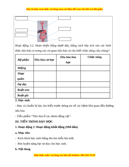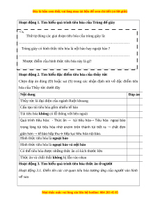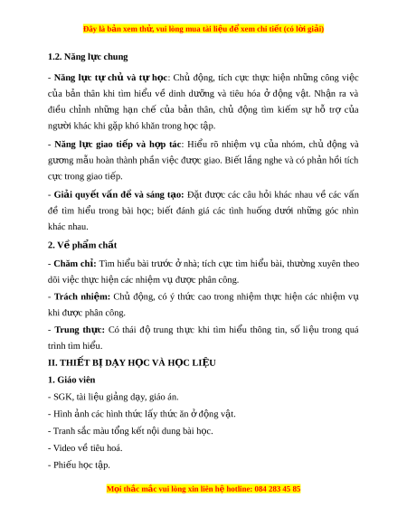 ự tự chủ và tự h c ọ : Chu đ ng, ô tích c c ự th c ự hi n ê nh ng ữ công vi c ê c a u b n ả thân khi tim hi u ể vê dinh dư ng ơ và tiêu hóa ở đ ng ô v t ậ . Nh n ậ ra và đi u ê ch nh ỉ nh ng ữ h n ạ chê c a u b n ả thân, chu đ ng ô tim ki m ê sự hỗ trợ c a u ngư i ờ khác khi g p khó khăn ặ trong h c t ọ p. ậ - Năng l c ự giao ti p ế và h p ợ tác: Hi u ể rõ nhi m ê vu c a u nhóm, chu đ ng ô và gư ng ơ m u ẫ hoàn thành ph n ầ vi c ê đư c ợ giao. Bi t ê l ng ắ nghe và có ph n ả h i ô tích c c ự trong giao ti p. ê - Giải quy t ế v n ấ đề và sáng t o ạ : Đ t ặ đư c ợ các câu h i ỏ khác nhau vê các v n â đê tim hi u ể trong bài h c; ọ bi t ê đánh giá các tinh hu ng ố dư i ơ nh ng ữ góc nhin khác nhau. 2. V ph ề ẩm ch t ấ - Chăm ch : i Tim hi u ể bài trư c ơ ở nhà; tích c c ự tim hi u ể bài, thư ng ờ xuyên theo dõi vi c t ê h c hi ự n các ê nhi m ê v đ u ược phân công. - Trách nhi m ệ : Chu đ ng, ô có ý th c ư cao trong nhi m ê th c ự hi n ê các nhi m ê vu khi đư c ợ phân công. - Trung th c: ự Có thái đ ô trung th c ự khi tim hi u ể thông tin, s ố li u ê trong quá trinh tim hi u. ể II. THIÊT B D I AY H C O VÀ H C O LI U Ê 1. Giáo viên - SGK, tài li u g ê i ng ả d y ạ , giáo án. - Hinh nh các ả hinh th c l ư y t â h c ăn ư đ ở ng ô v t ậ . - Tranh s c ắ màu tổng k t ê n i ô dung bài h c. ọ - Video v t ê iêu hoá. - Phi u h ê c t ọ p. ậ M i