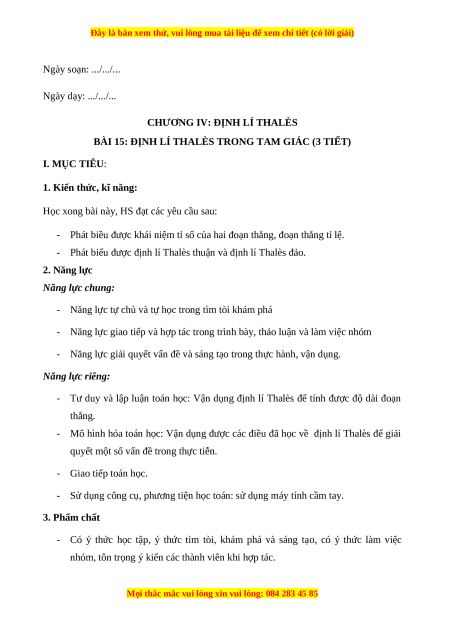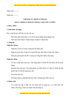 BÀI 15: ĐỊNH LÍ THALÈS TRONG TAM GIÁC (3 TIẾT) I. MỤC TIÊU: