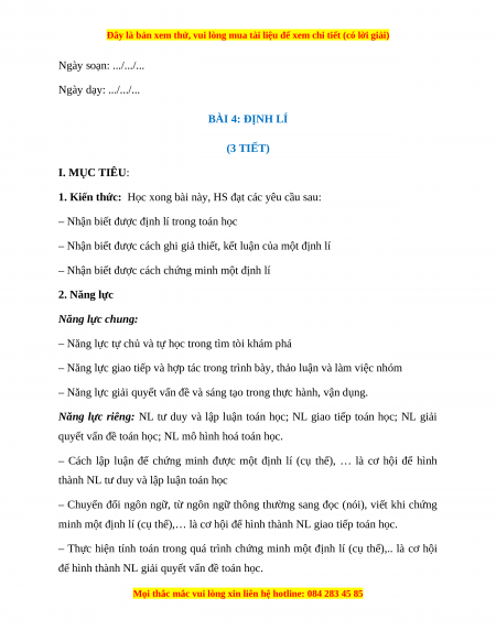 Ngày soạn: .../.../... Ngày dạy: .../.../... BÀI 4: ĐỊNH LÍ (3 TIẾT) I. MỤC TIÊU: