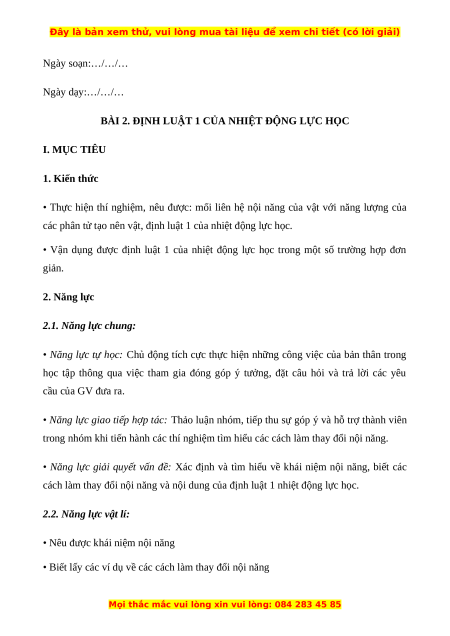 • Vận dụng được định luật 1 của nhiệt động lực học trong một số trường hợp đơn giản. 2. Năng lực